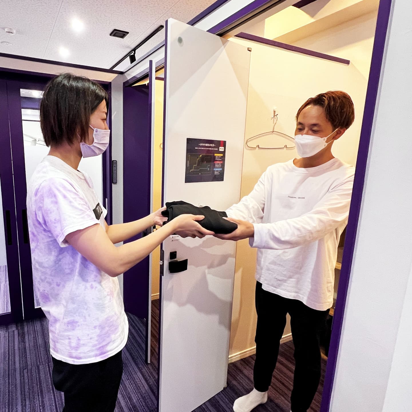 | 施術を受ける際はスタジオで貸し出しているレンタルウェア(スウェット)に更衣室で着替えてから施術を受けていただきます。衣装の貸し出しは無料となっております。 |